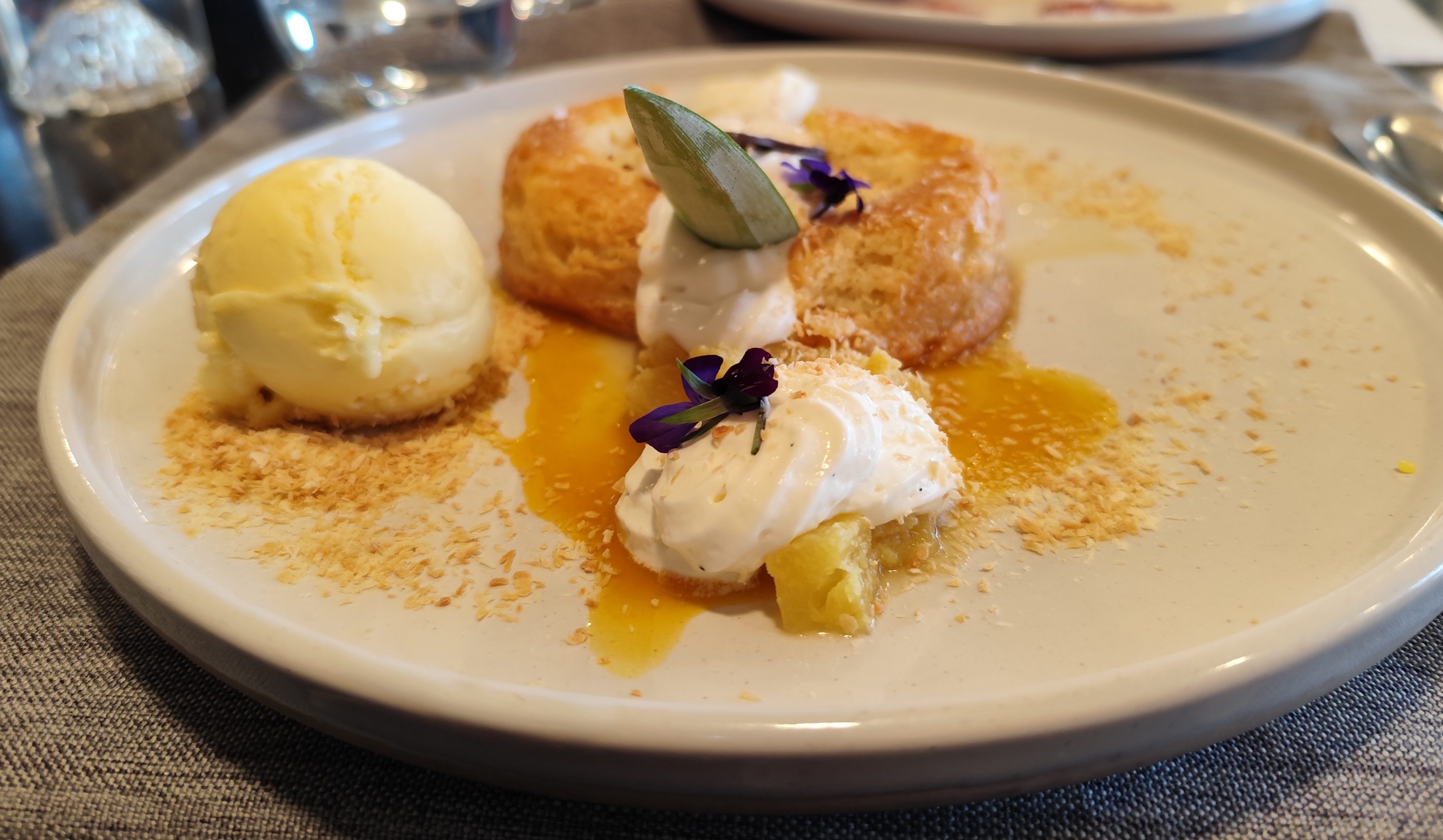Au rhum exotique, chantilly noix de coco, ananas rôti, coulis passion