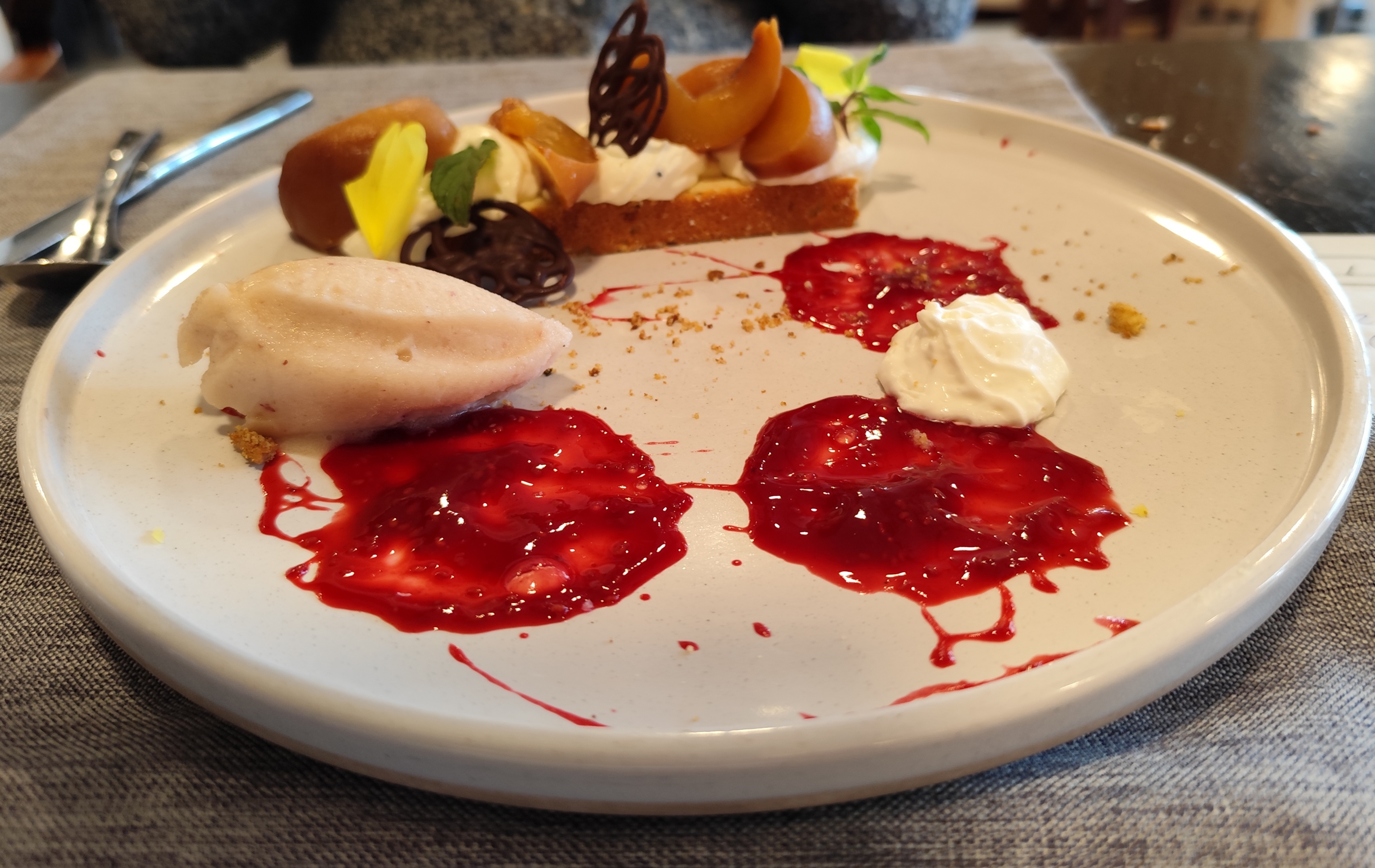 Pochée à la verveine et en sorbet, biscuit amande et thym, crème citron